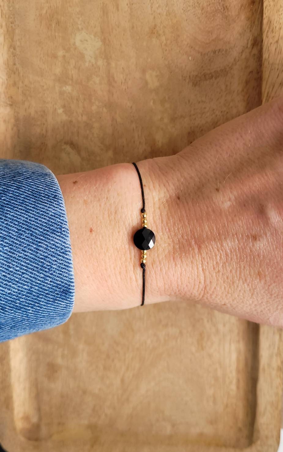 Bracelet cordon fin noir compos d'un cristal de Swarovski noir de 8 mm et de perles soit en argent massif 925 soit en plaqu or.